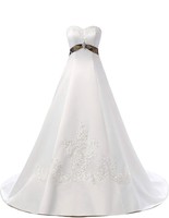 This sunvary white and camouflage long wedding dress is done in white satin and is tastily accented with camo detailing along the top and in the lining of the side slit.